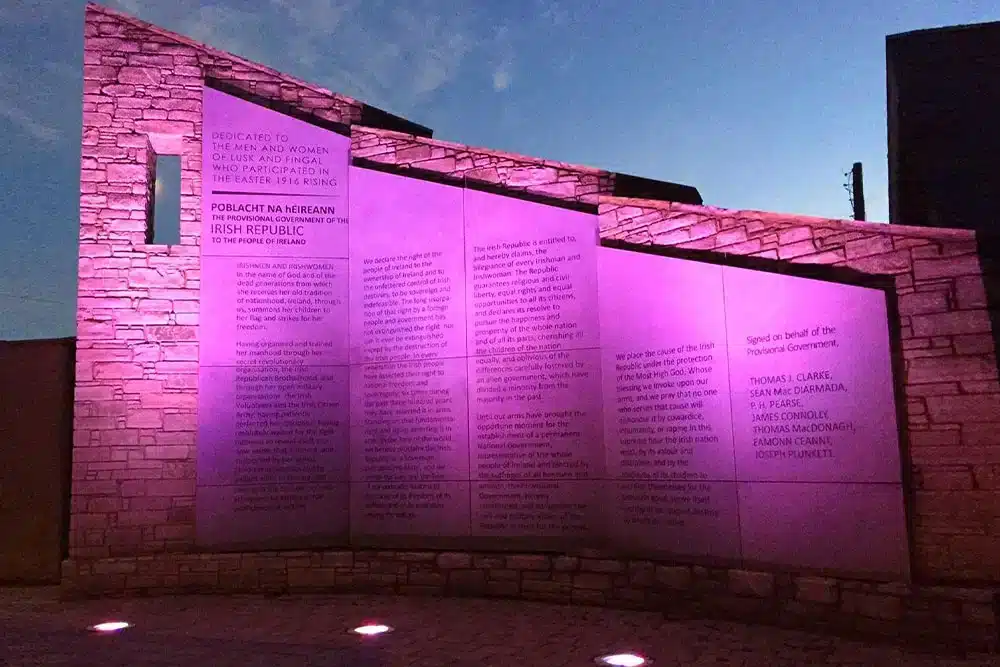 Lusk Community Council launched its fundraising campaign on St Patrick’s Day this year for the erection of a 1916 Memorial dedicated to the men and women of Lusk and the North County who participated in the Easter Rising in 1916. The project follows two years of work by Lusk Community Council to create a permanent memorial. The public response to the project was fantastic and the newly built monument is bound to leave a permanent legacy for the people of both Lusk and the North County. Lusk Community Council officially dedicated their 1916 memorial at the Village Green, Lusk, beside the Carnegie Library, on Saturday 24th September. The dedication was performed by Mayor of Fingal, Councillor Darragh Butler, and local public representatives and a large number of guests.