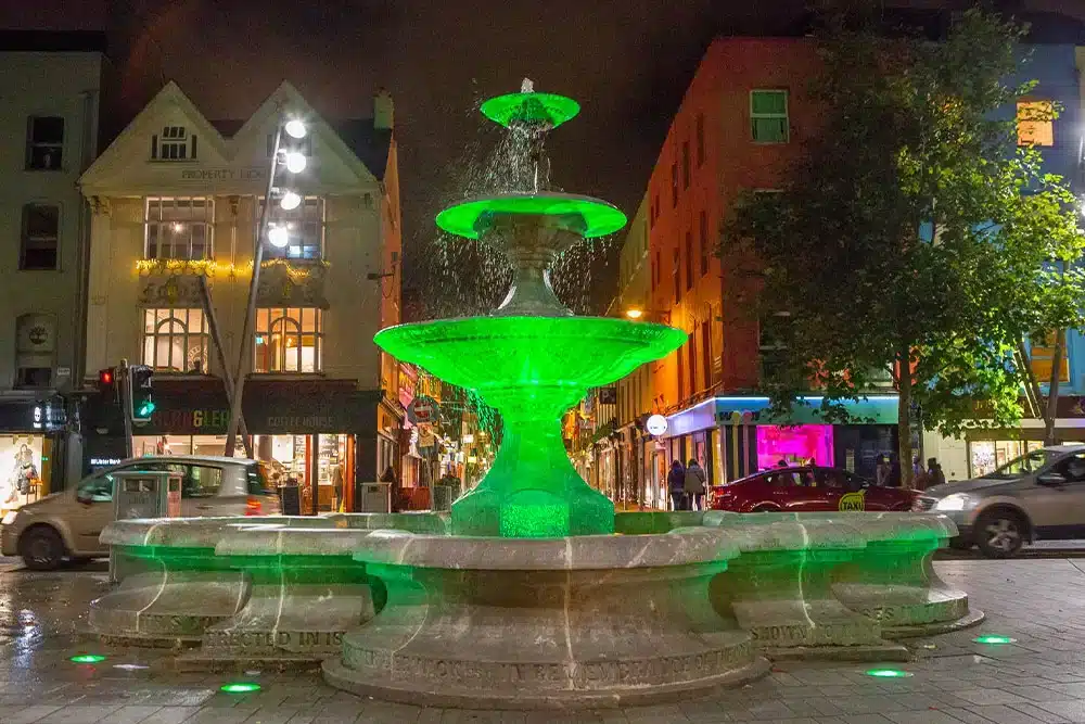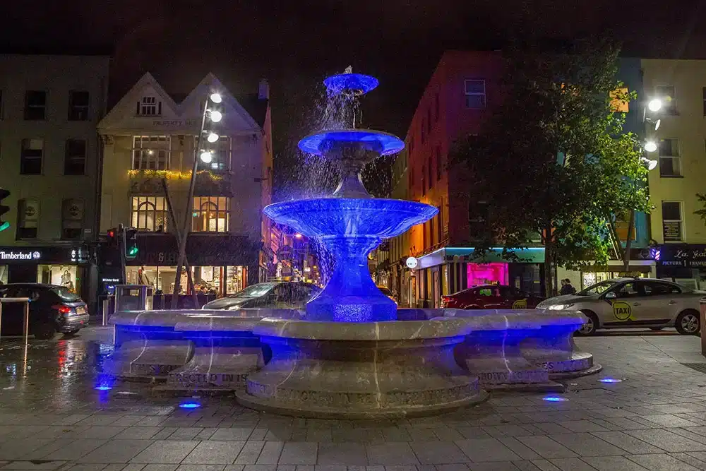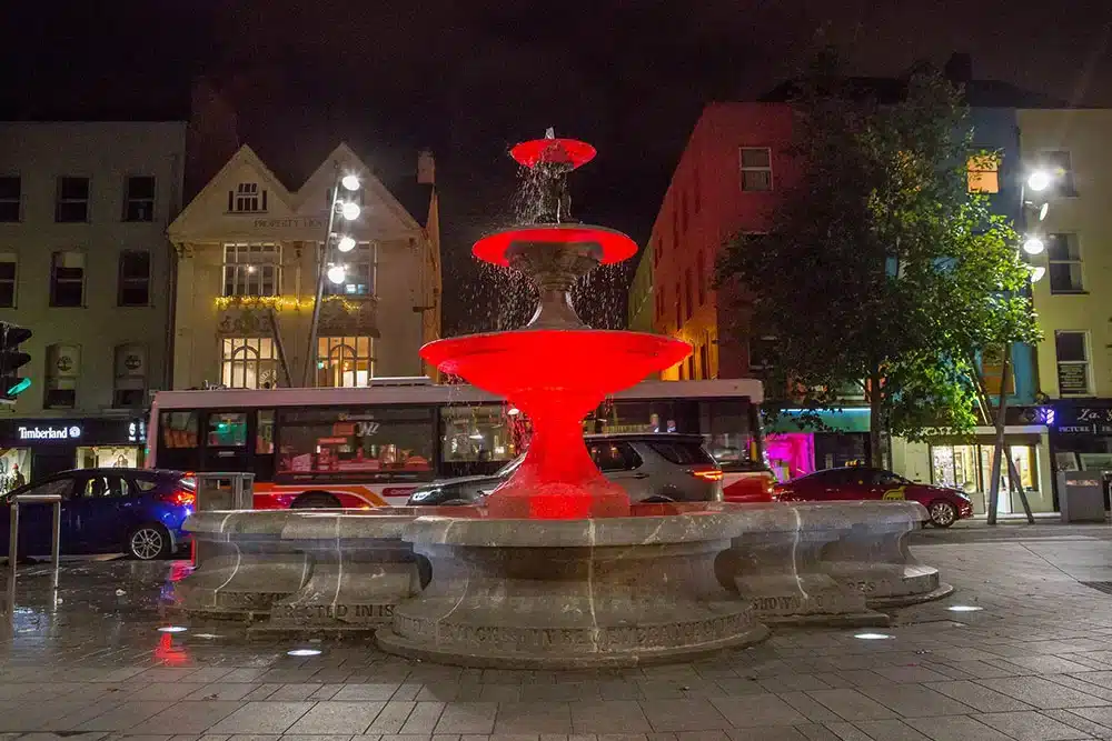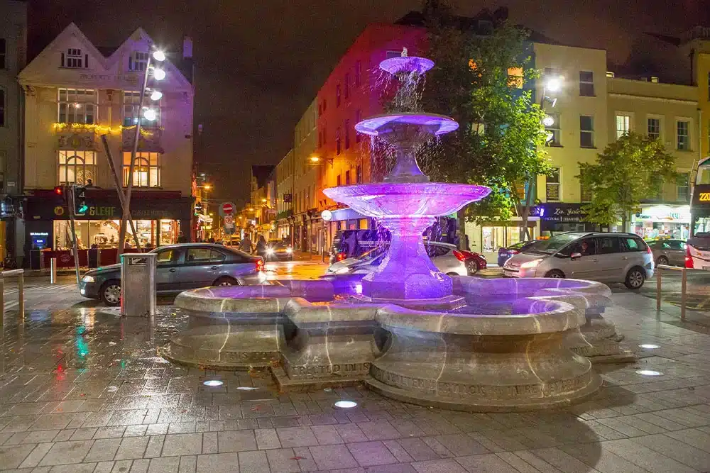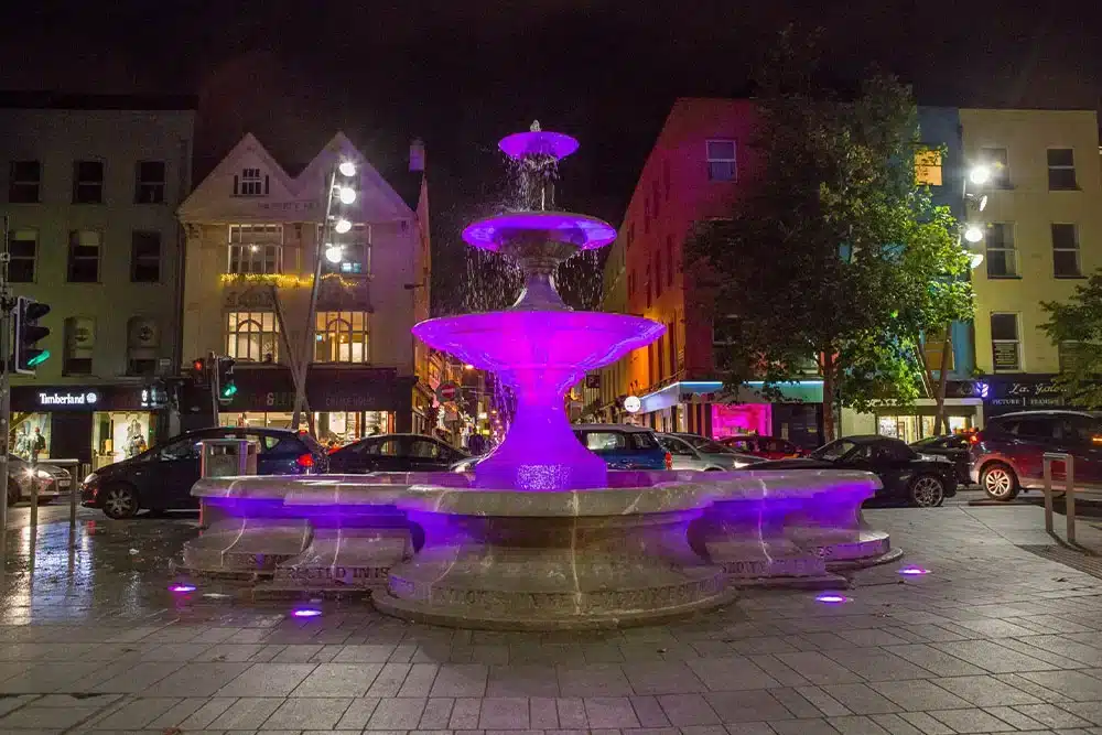 The historic Berwick Fountain, a Victorian-era public monument in Cork City, has been beautifully revitalised with a custom architectural lighting solution by the Fantasy Lights team. Designed by Sir John Benson and completed in 1860, the fountain is a striking example of 19th-century civic design. Its limestone base, square plan with circular side projections, and ornate central structure featuring entwined dolphins across three tiers, make it one of Cork’s most recognisable features.