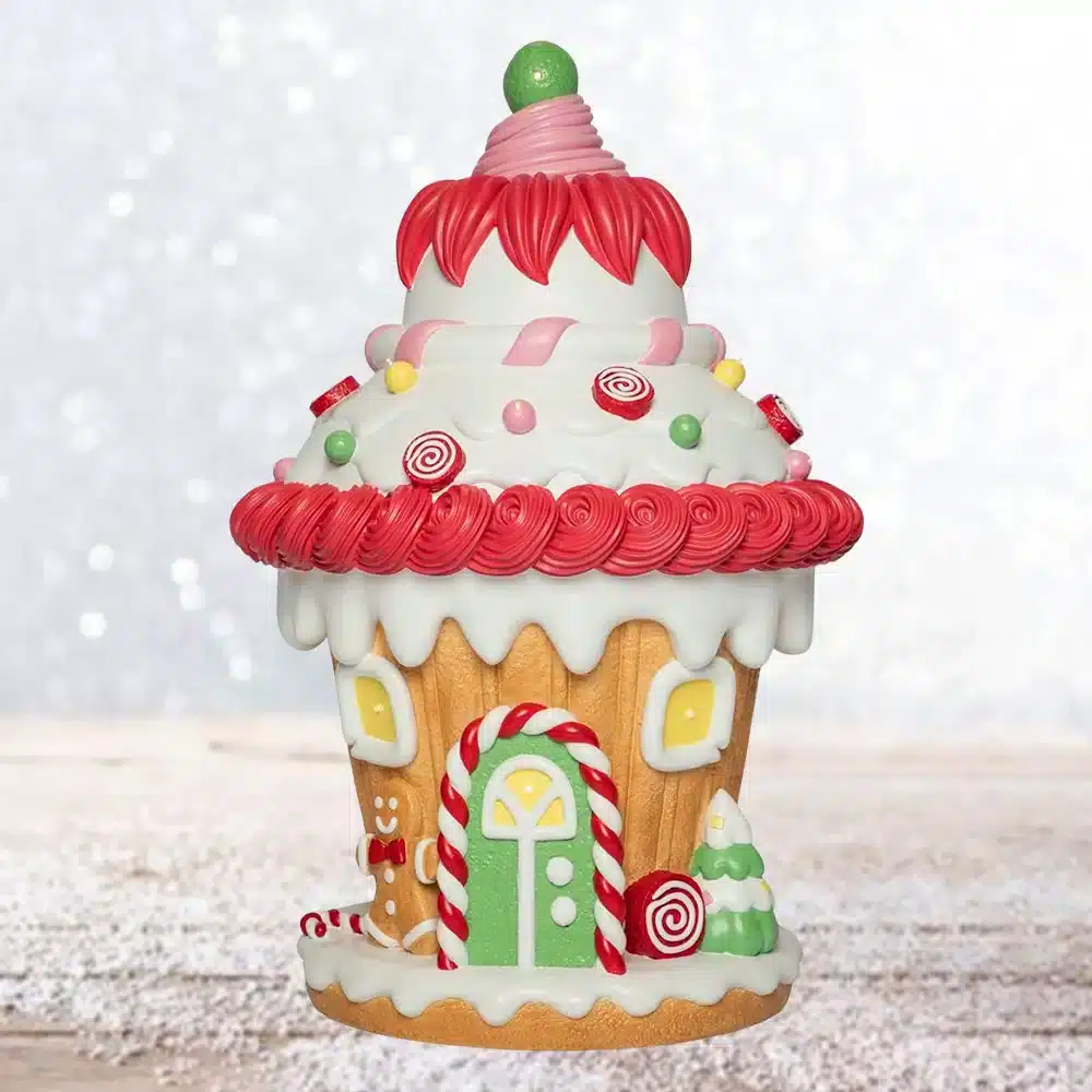 Bring sweet festive magic into your display with this battery operated LED large fibreglass gingerbread house, designed in the shape of a giant cupcake. Standing at 100cm tall, this decoration blends the charm of a Christmas village with the joy of a bakery inspired treat, making it a delightful centrepiece for seasonal displays. The cupcake portion is finished in white frost, swirled with red icing and decorated with pink and red candy swirls.