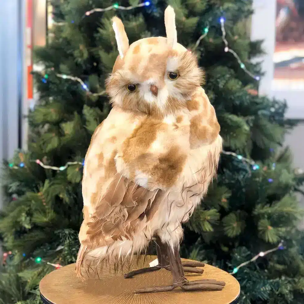 Create a woodland feature in your festive décor with this brown furry owl Christmas decoration with pointed ears, standing 50cm tall. Made from polyfoam, polyester and real feathers, giving it a soft and fluffy texture that captures the charm of nature. The plumage is finished in a light brown and tan shades with dark feathers on the wings and tail for added depth and realism. Its pointed ears add extra character to the design, while the yellow gold eyes give the owl a watchful expression. Completed with a dark brown beak and feet, this decoration feels both realistic and decorative.