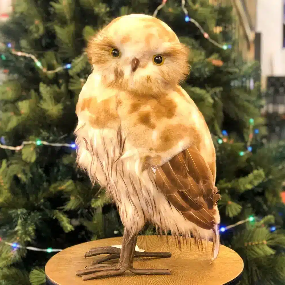 Add woodland elegance to your festive décor with this brown furry owl Christmas decoration with smooth head, standing 50cm tall. This owl is made from polyfoam, polyester and real feathers, creating a soft, fluffy texture with a natural, lifelike appearance. The plumage is finished in a mottled light brown and tan tone, while the wings and tail are highlighted with slightly darker feathers for added depth. Its smooth head design gives the owl a stunning look, while the yellow gold eyes with a realistic expression bring character and charm. Completed with a dark brown beak and feet, this owl makes a captivating piece for festive displays.