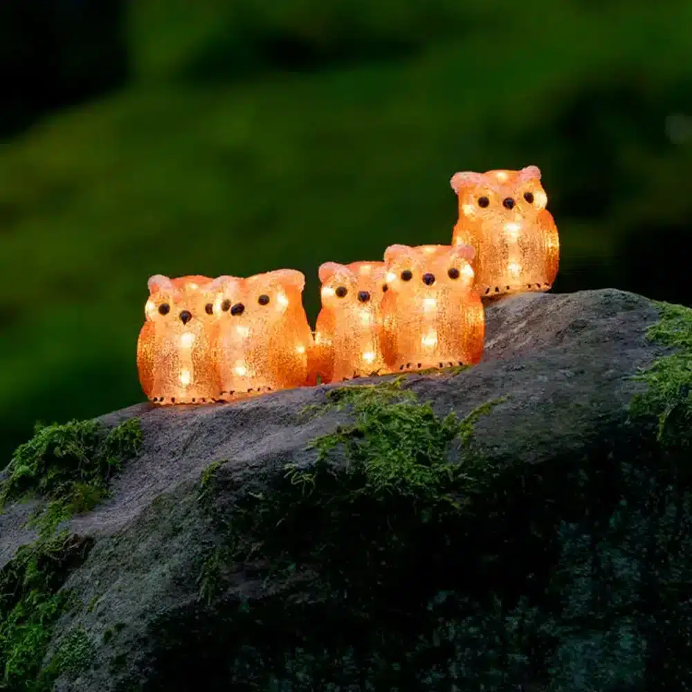 Add a touch of woodland charm to your Christmas display with this delightful owls family outdoor decoration set made from acrylic. This set features five adorable owls in orange colour, designed to bring warmth and character to your festive décor. Each owl features 8 warm white LEDs that create a soft glow and highlight their playful design. Together, the family of owls shines with 40 warm white LEDs at 2550K, producing a cosy amber toned effect.