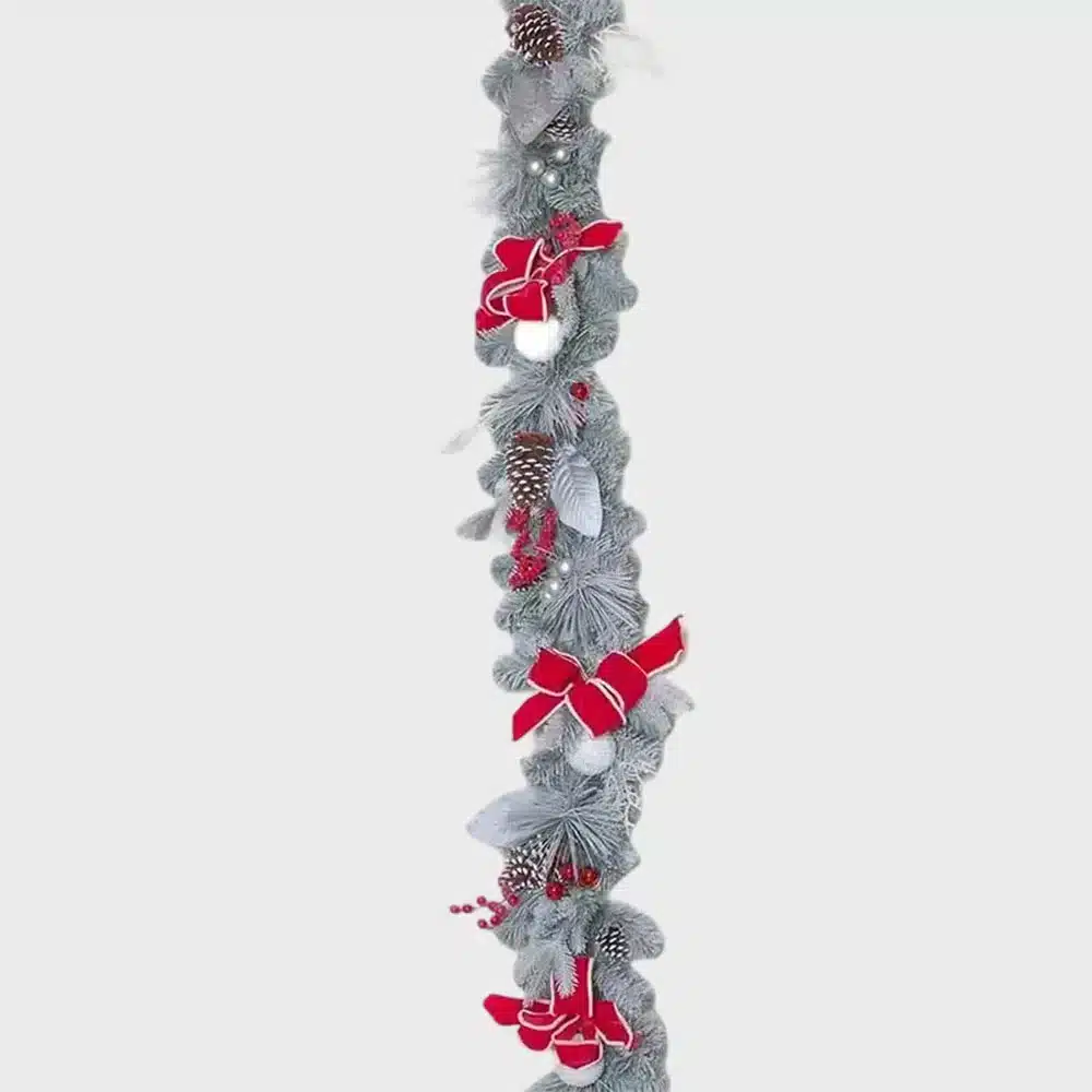 • Includes red ribbons, frosted baubles, pine cones and berries for a full festive look.