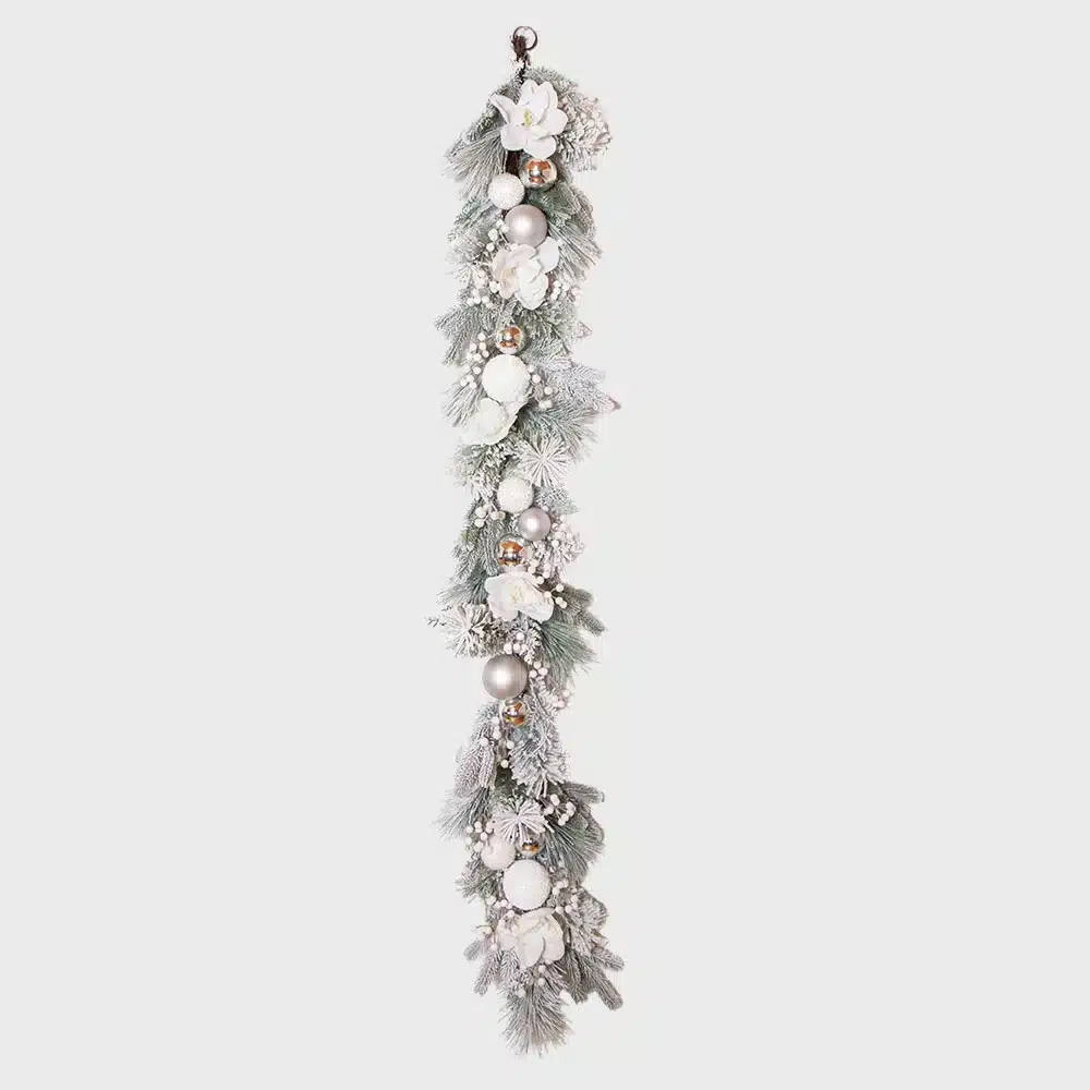 Add a touch of frosty elegance to your festive décor with this mixed white bauble frosted Christmas garland, measure 180cm long and 25cm wide. This beautiful Christmas garland blends shimmering accents with snow-kissed foliage for a refined winter look. The design features frosted branches with a mix of white baubles, frosted flowers, berries and delicate foliage, creating depth and texture. The subtle sparkle of the baubles contrasts with the soft, snow-dusted effect, giving the garland a luxurious, wintry feel.