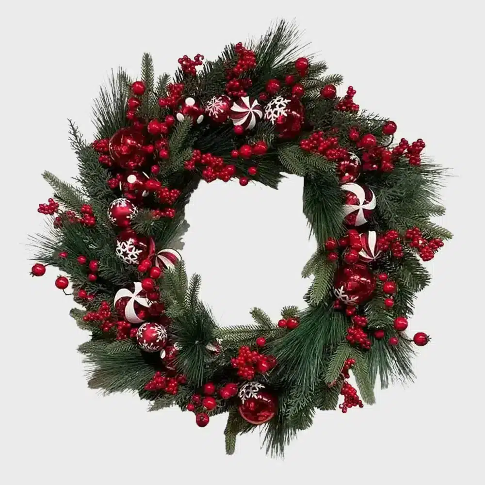 Add a playful festive touch to your décor with this candy mixed baubles Christmas wreath, measure 75cm in diameter. This wreath combines classic greenery with vibrant baubles and berry accents for a joyful Christmas display. The wreath features red baubles in various sizes, decorated with candy-inspired patterns and snowflake designs for a fun seasonal twist. Lush green branches provide a full, natural base while clusters of red berries add extra colour and texture. The combination of traditional greenery and whimsical baubles creates a wreath that is both eye-catching and full of festive charm.