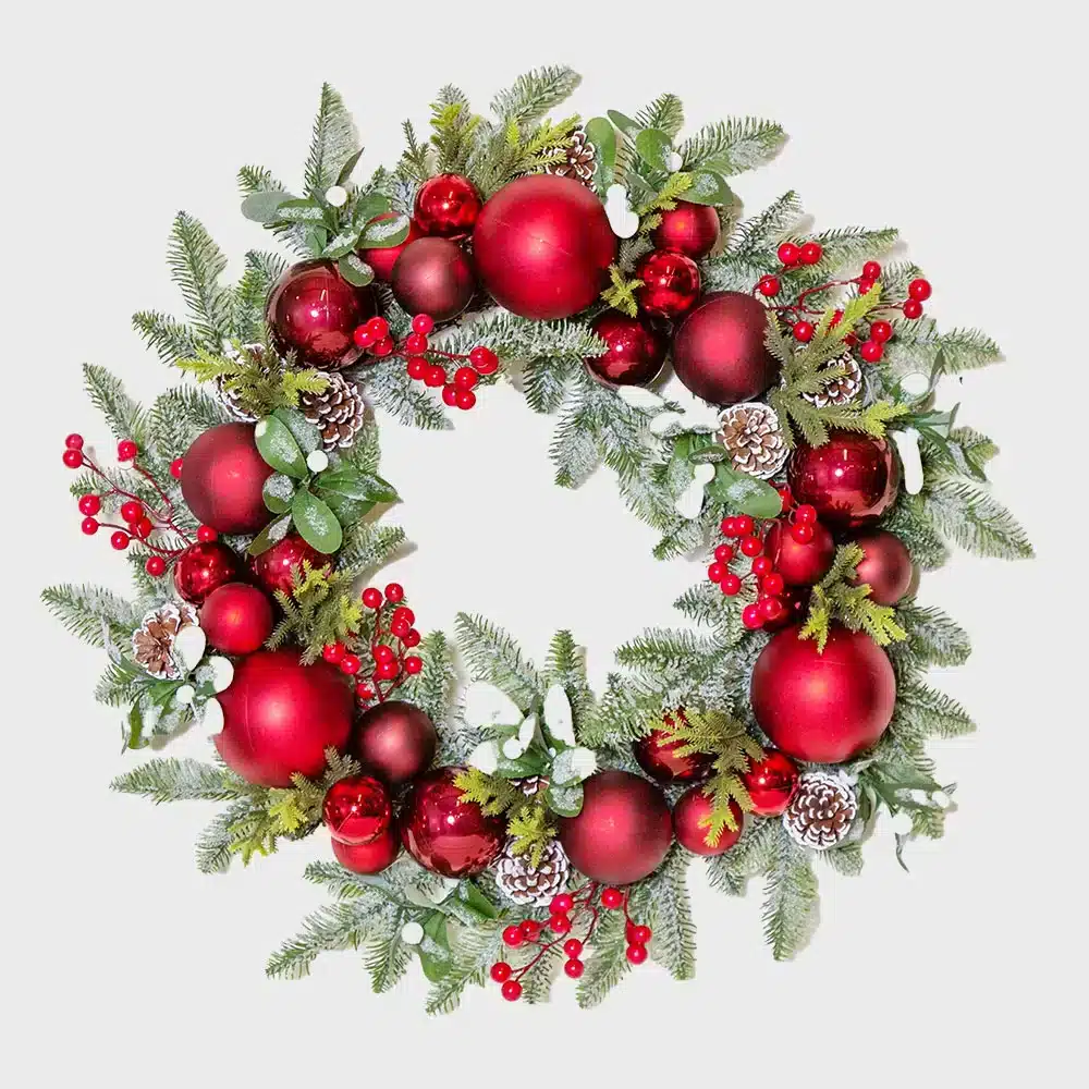 Love the vibrant red theme? You may also like Christmas garland with baubles, frosted red and white Christmas wreath, candy mixed baubles wreath. Browse the full Christmas Wreaths Collection to explore even more festive styles. For seasonal decorating inspiration and updates, follow us on Facebook.