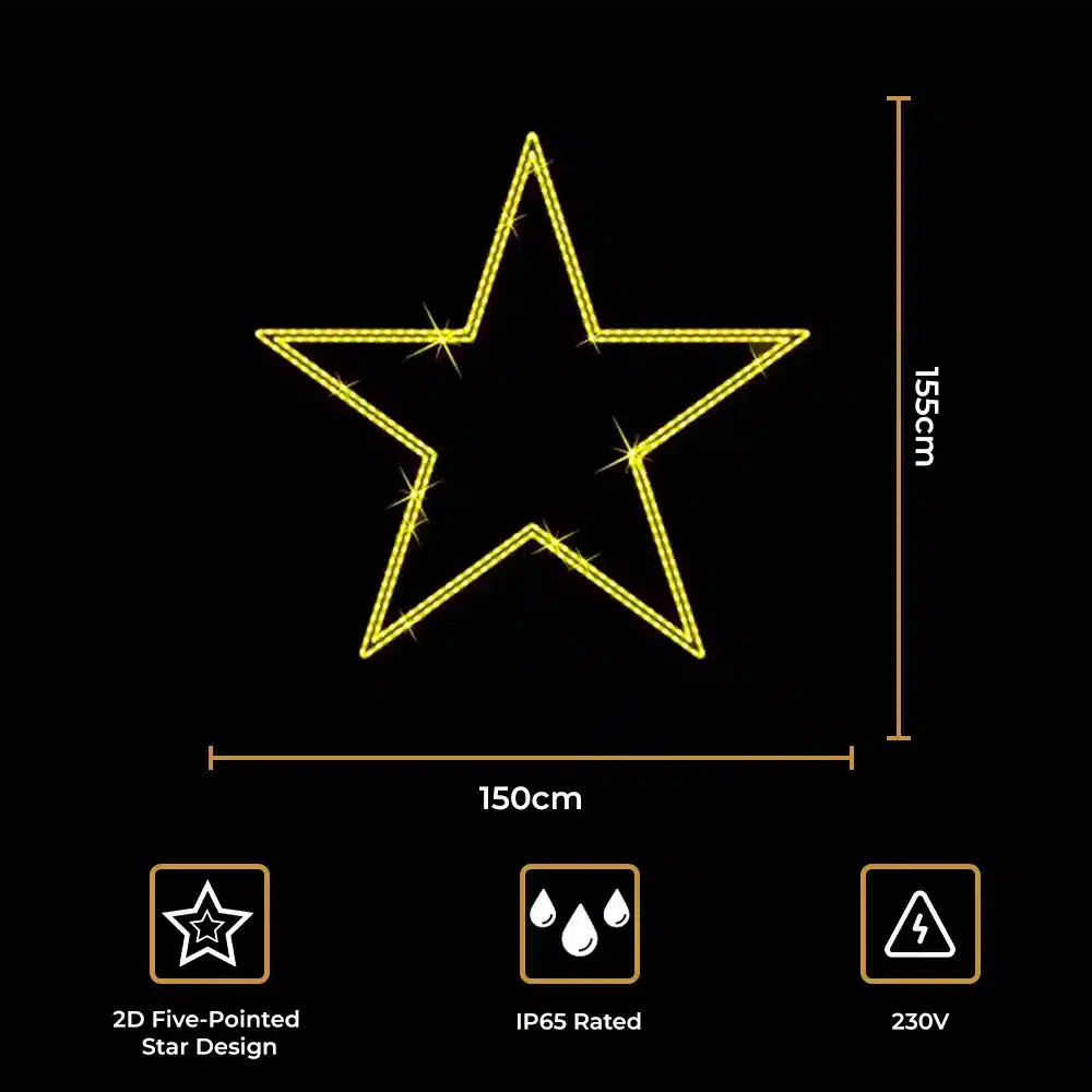 With a size of 1.5m wide by 1.55m high, this star is ideal for building façades, shopfronts, lampposts and festive event spaces. Rated IP65, it is weather-resistant for reliable outdoor use, while still suitable for large indoor displays. Powered by 230V mains, this 2D Christmas LED star decoration provides consistent, long-lasting illumination for the festive season.