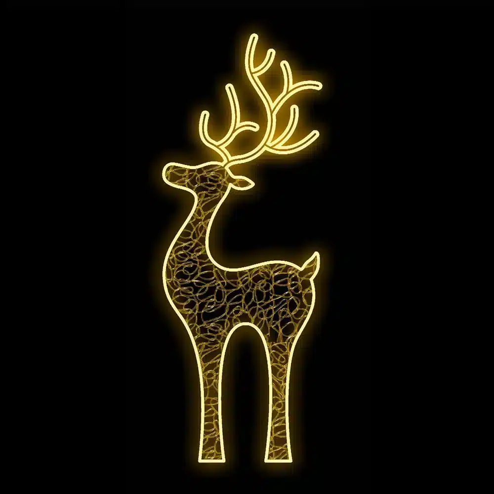 Create a standout festive display with our 2D LED reindeer Christmas decoration, 140cm tall, designed for both indoor and outdoor use. This illuminated reindeer brings elegance and charm to Christmas scenes in shopping centres, hotels, gardens and public spaces. The reindeer is made from a durable aluminium frame and PVC net, ensure stability and long-lasting use. Its outline glows bright with LED neon flex, while the interior is filled with PVC net, giving it structure and depth.