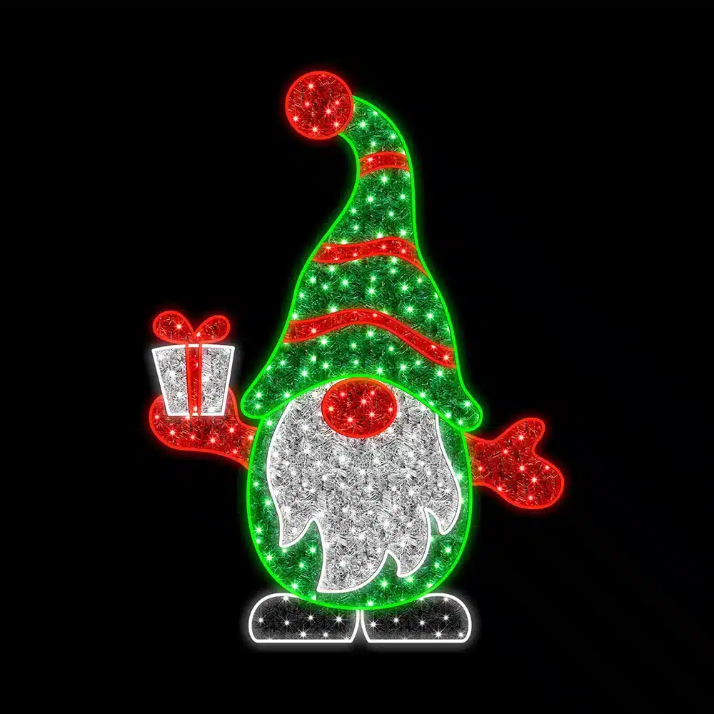 Built on aluminium frame, this 2D decoration runs on a safe 24V low voltage system and consumes just 55W, making it both efficient and reliable. Measure 1.45m wide by 2m high, it is large enough to stand out in shopping centres, hotels, town squares and seasonal events. Fully IP65 rated, this 2D Santa gnome with gift Christmas decoration is weather-resistant for outdoor use while also suitable indoors.