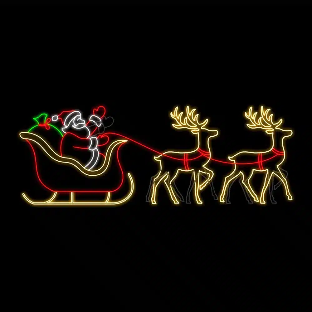 • Two reindeers leading the sleigh, outlined in warm white and red rope lights.