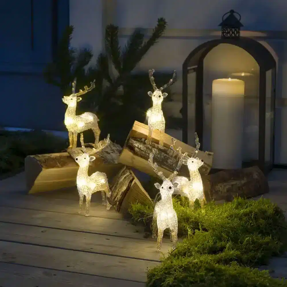 Bring a touch of festive charm to your display with this delightful reindeer outdoor Christmas decoration set, made from durable acrylic. This set includes 5 standing reindeer figures, each illuminated with 8 warm white LEDs for a total of 40 LEDs across the set. Shining at 2700K, the LEDs produce a cosy golden glow that creates a warm festive atmosphere. Each reindeer stands 19cm tall with compact dimensions, making them perfect for lining garden paths, decorating porches or enhancing indoor scenes.