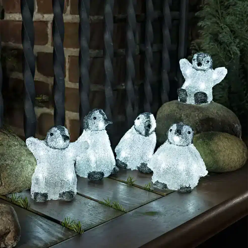 Create a playful winter scene with this adorable baby penguins outdoor Christmas decoration set, made from high quality acrylic. This set features five penguins made in black and white colour, designed to add character and sparkle to your festive display. Each penguin is illuminated with 8 ice white LEDs that shine brightly and bring these little figures to life. Standing at 12.5cm tall and 12cm wide, these baby penguins are compact enough to decorate pathways, garden displays or porches. The set includes a 5 metre white PVC cord and a low voltage 24V transformer for safe use, while the IP44 rating ensures durability for outdoor placement.
