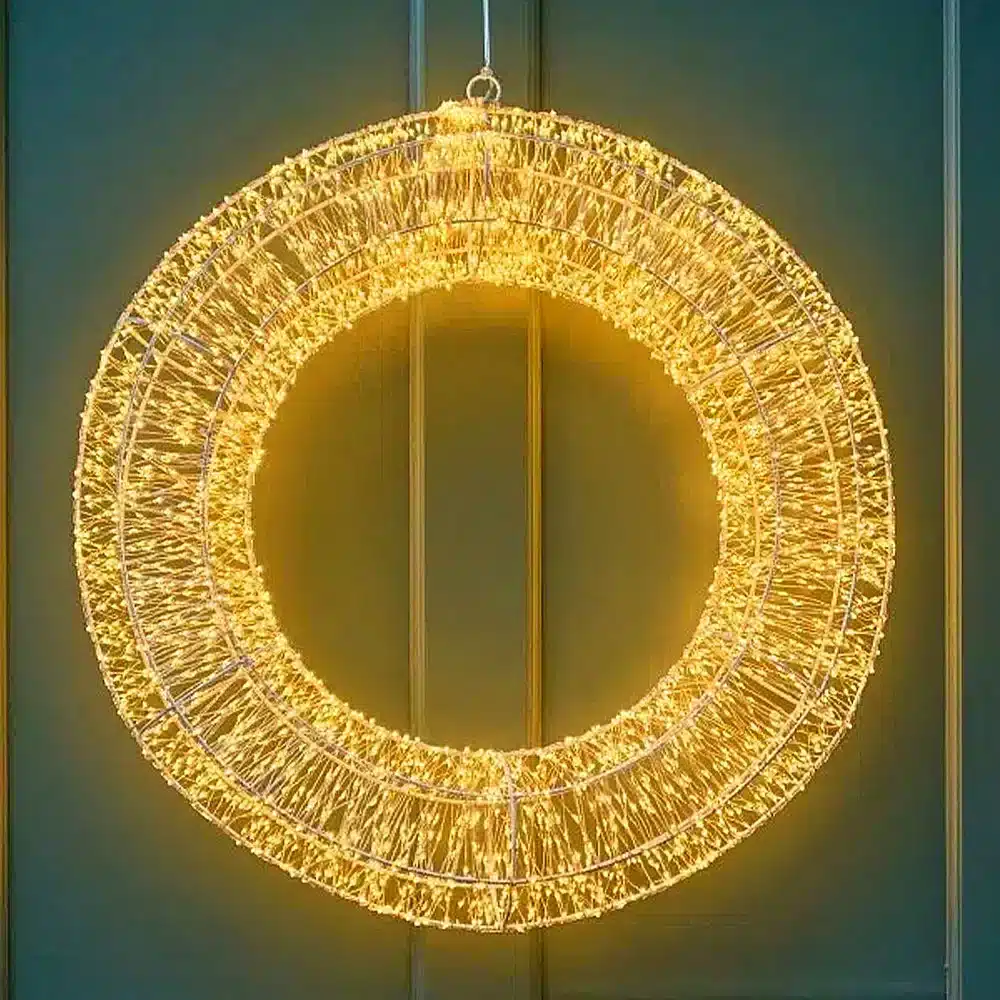 Make a bold festive statement with this gold frame pre-lit Christmas wreath, measure an impressive 120cm in diameter. This oversized wreath combines a premium gold metal frame with elegant gold copper cable, creating a luxurious centrepiece for large displays. The wreath is pre-lit with 9,000 warm white mini LEDs, provide a dazzling glow that fills the frame with light. The close LED arrangement delivers an intense sparkling effect that ensures maximum visual impact. Perfect for hotel lobbies, shopfronts, event spaces or large residential entrances.