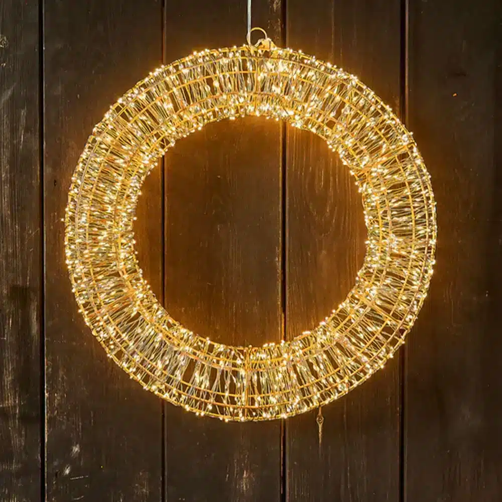 Create a dazzling focal point this festive season with the gold frame pre-lit Christmas wreath, measure 90cm in diameter. This elegant wreath combines a striking gold metal frame with shimmering gold copper cable for a luxurious modern finish. The wreath is pre-lit with 6,000 warm white mini LEDs, deliver a brilliant glow that radiates across every branch of the frame. The dense concentration of lights creates an impressive effect, perfect for making an impact in residential, retail, hospitality or event spaces.