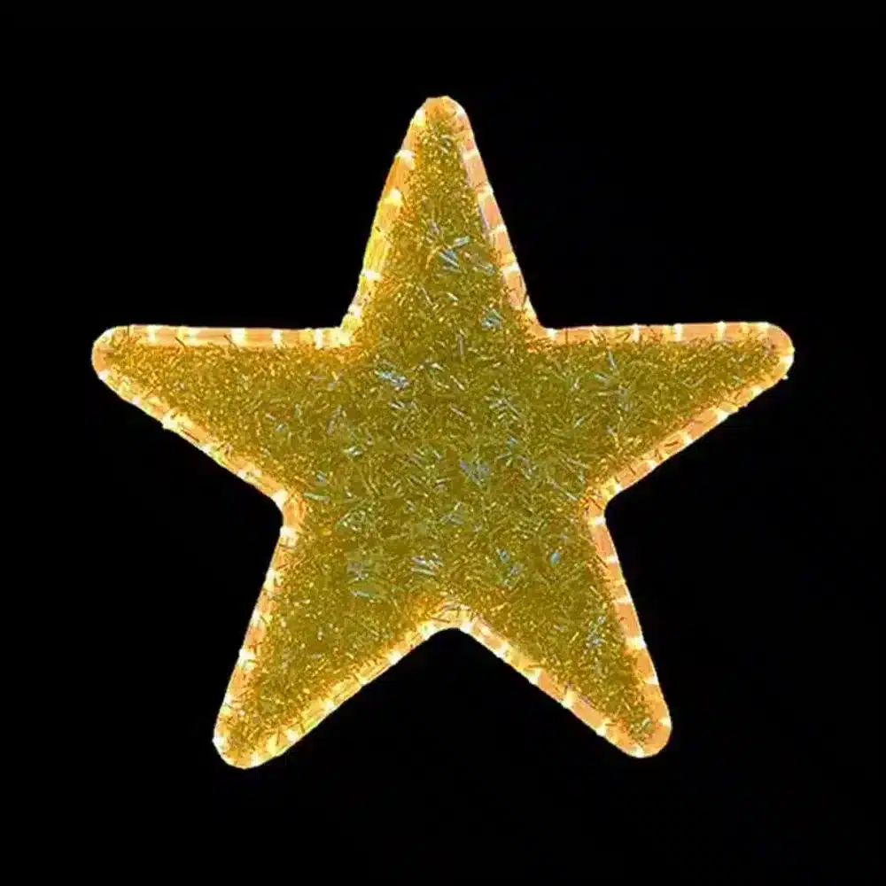 Bring a warm festive glow to your display with this gold metallic 2D star decoration, made from LED rope lights and metallic carpet. This elegant motif is designed with a warm white LED rope light outline and filled with a gold metallic carpet. The combination of bright warm white LEDs and reflective gold tones makes this star a standout feature, adding depth and richness to any festive scene.