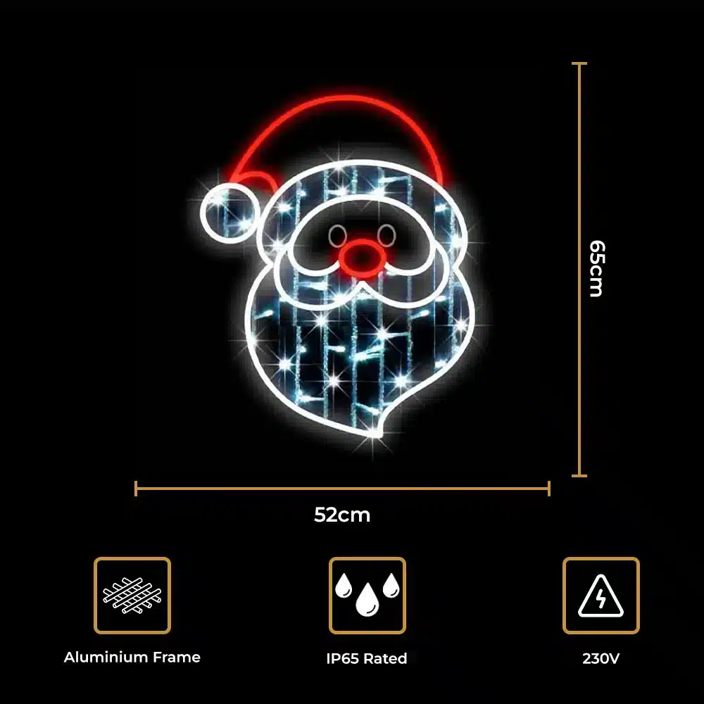 Add festive cheer to your display with the LED Santa Claus Christmas 2D decoration, a bright and joyful motif that captures the spirit of the season. Made from aluminium frame and illuminated with LED rope lights and string lights, this decoration is built for both indoor and outdoor use. Ice white LED rope lights outline the Santa face, while matching string lights fill the design to create a crisp and radiant glow. A red rope light outlines his round nose and the classic Santa hat features bright red rope light detail.