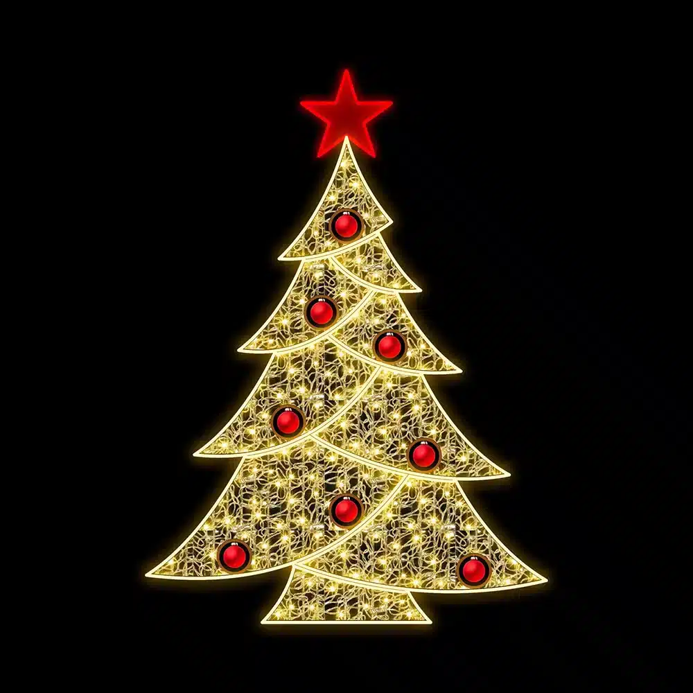 Decorative circular accents adorn the tree, each featuring 2D red baubles. Designed with energy efficiency and safety in mind, this red star Christmas tree decoration runs on a 24V low voltage system, consume just 80W. With an IP65 rating, it is weather-resistant, making it ideal for large-scale festive installations in shopping centres, town squares, hotels and event spaces.