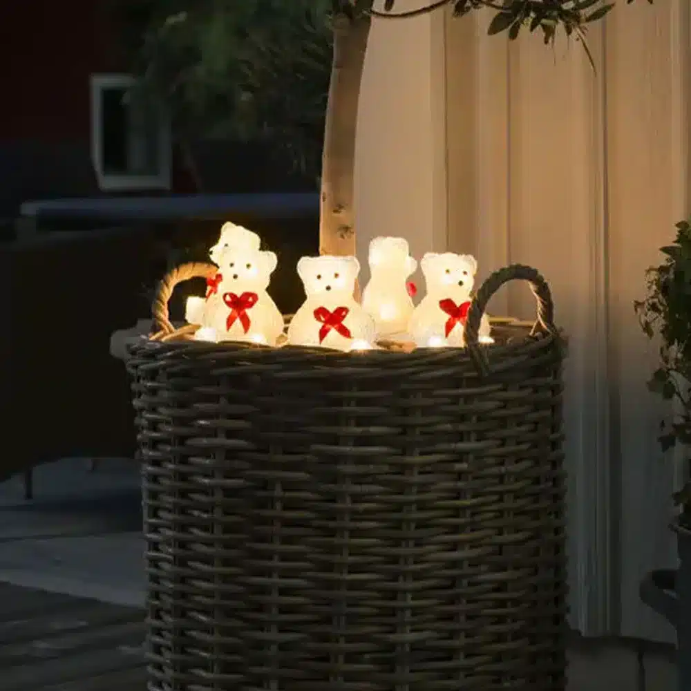 Bring playful charm to your festive display with this delightful teddy bears Christmas decoration set, made from high quality acrylic. This 5 piece set features five adorable acrylic teddy bears, each finished with a bright red bow for a classic festive look. Compact in size yet full of character, these sitting teddy bears make a warm and welcoming addition to both indoor and outdoor Christmas décor. Each bear is illuminated with 8 warm white LEDs, total 40 LEDs across the set, shining at 2700K to create a cosy golden glow. With an energy-efficient design, these acrylic teddy bears Christmas decoration set deliver maximum festive impact with minimal power use.