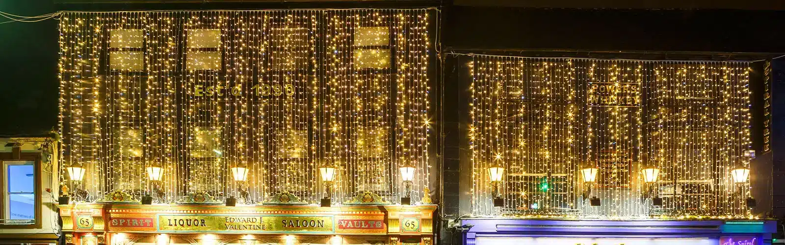 Add stunning vertical lighting to your outdoor or indoor spaces with our curtain Christmas lights. Designed with multiple LED strands hanging in rows, these lights create a waterfall effect, perfect to decorate walls, windows, balconies and building façades. Available in warm white, cool white and flashing LEDs with various drop lengths, our curtain lights are ideal for both residential and commercial use. Their versatile design allows you to easily cover large areas and bring Christmas cheer to any venue or home. Whether you are lighting a bar, restaurant, shopfront or your garden, these lights provide a dramatic and elegant display.