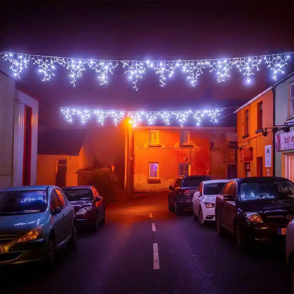 Each set is 4.2 metres wide and features 192 LEDs arranged in a staggered triangle pattern. The drops measure 20cm, 40cm, 60cm and 80cm, which helps create a fuller layered look across the display. This varied drop design adds depth and movement, making the lights stand out beautifully along roof edges, canopies and window lines. The set also comes with a white heavy-duty rubber cable.