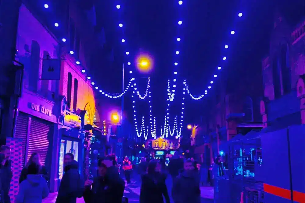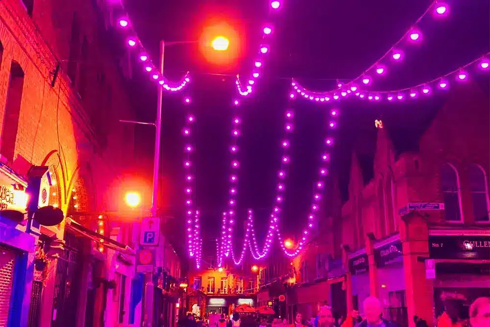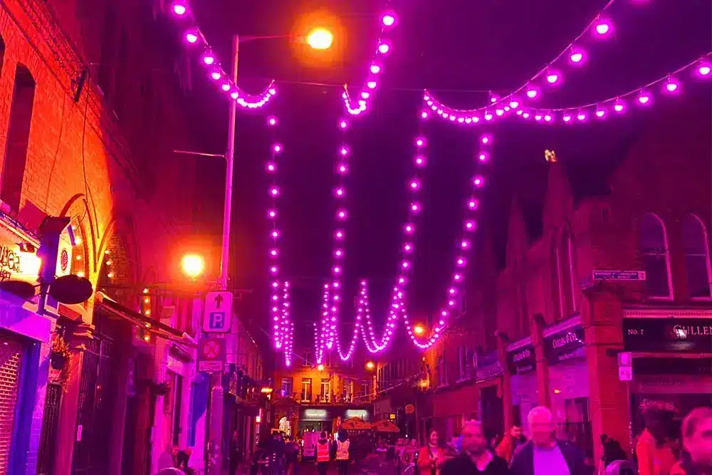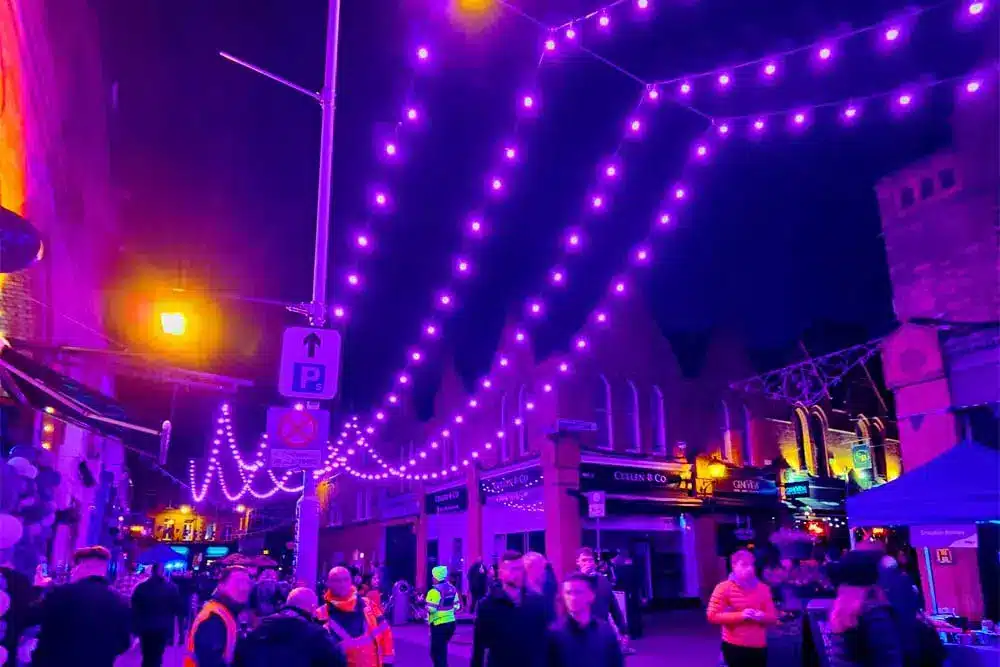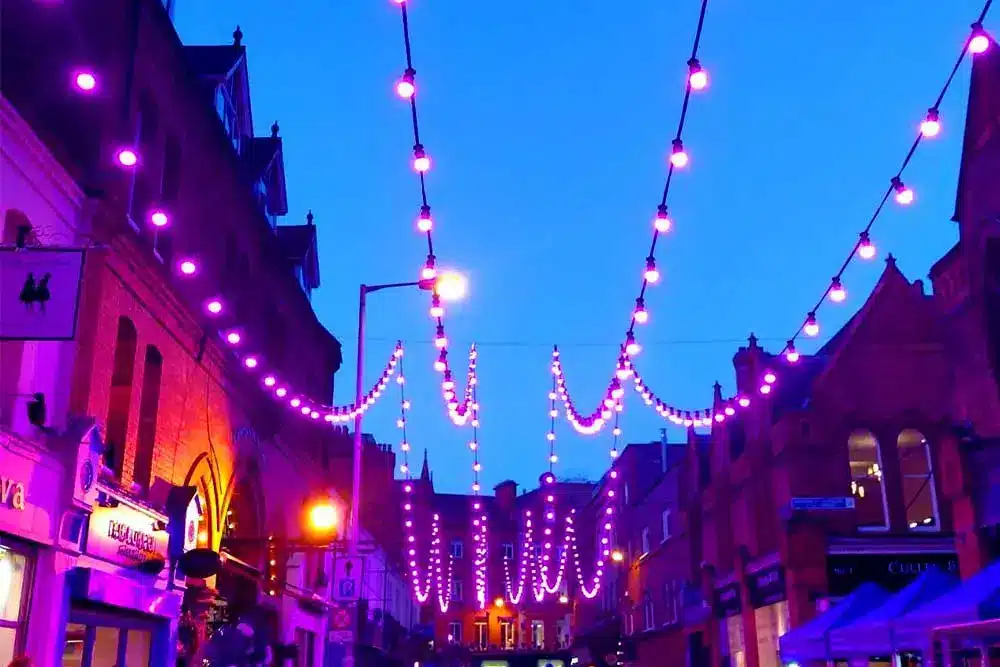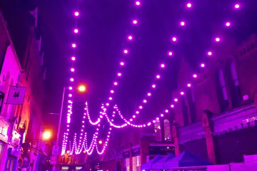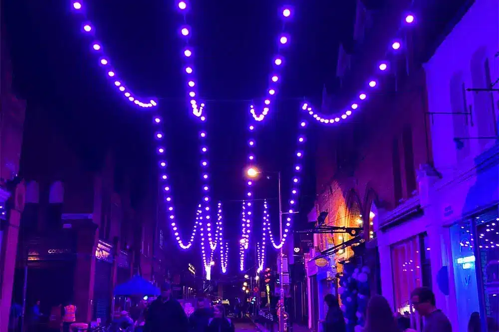 Paint the Town Purple was the request! Fantastic was the response! Fantasy Lights were delighted to be a part of the Purple Flag Celebrations event organised by Dublin Town. Purple Flag is an international accreditation that honours excellence in the appeal and management of a town or city centre area after 5pm. So Fantasy Lights lit up the street in Purple for the celebrations with our unique colour changing festoon system.