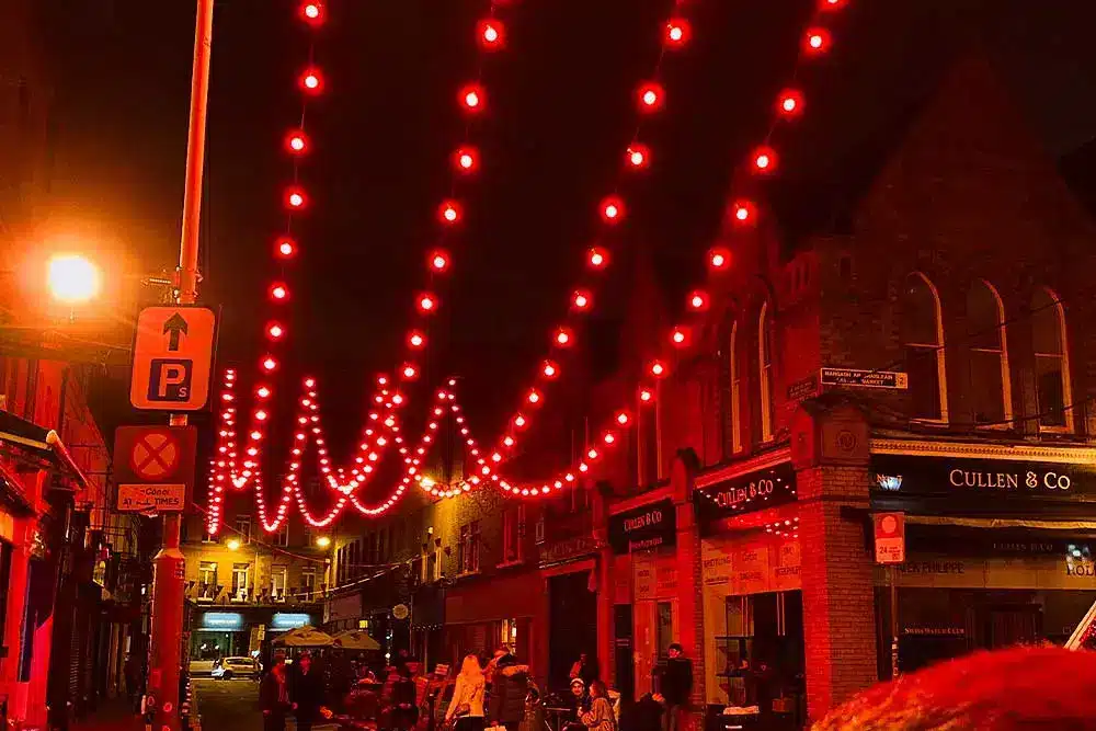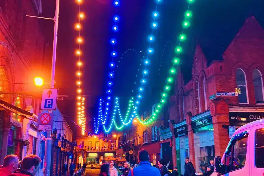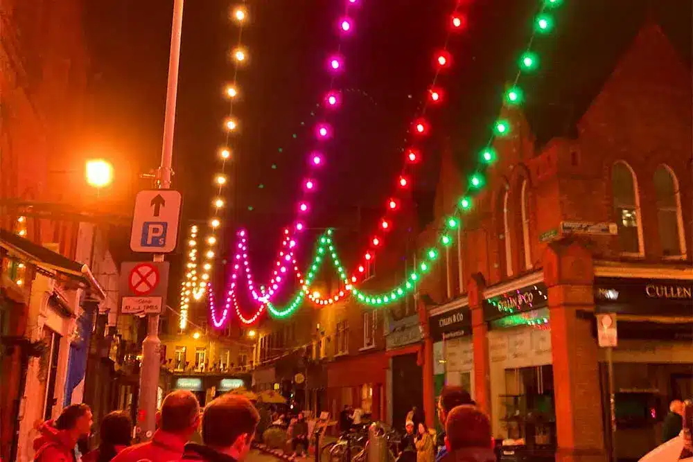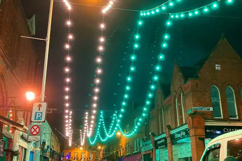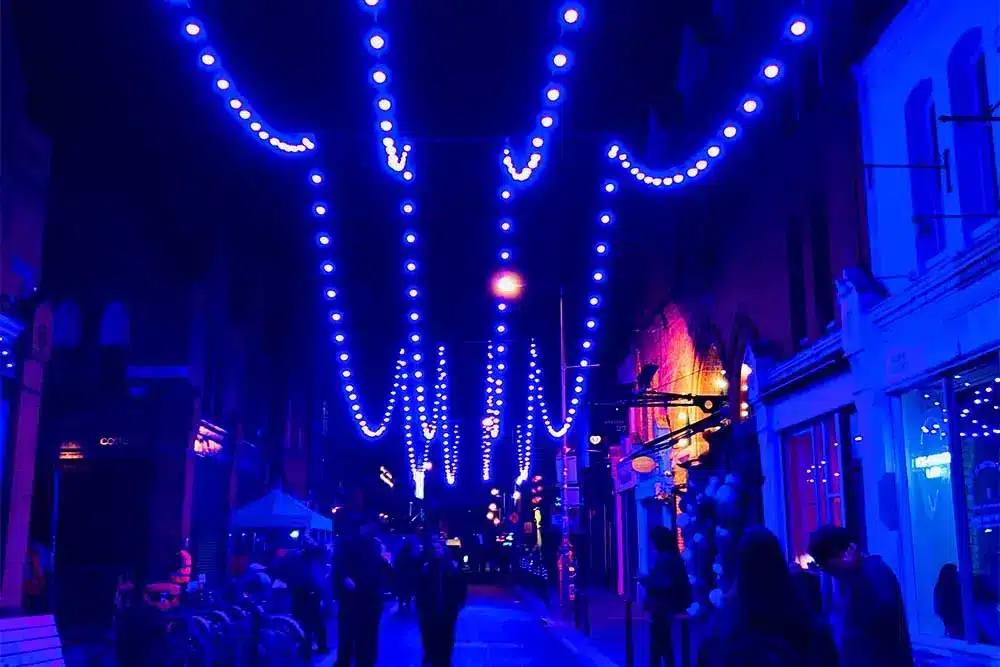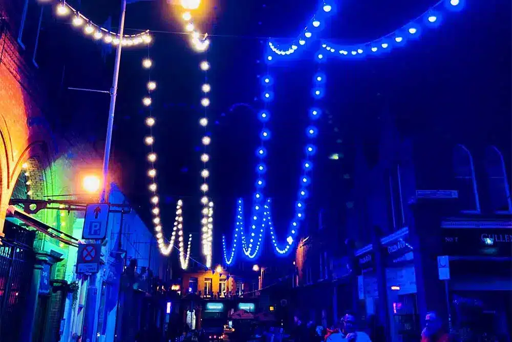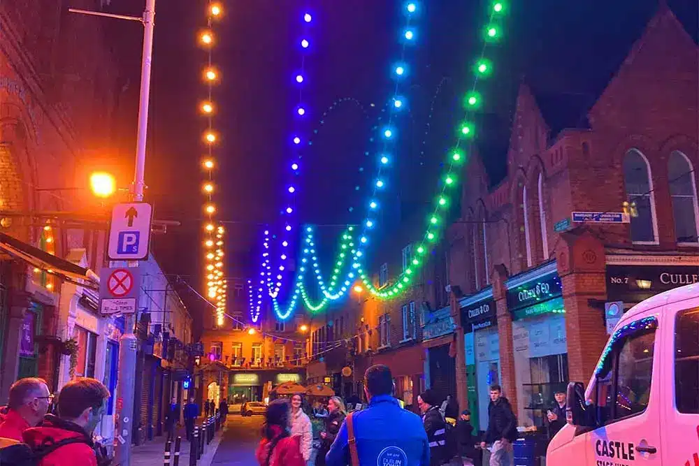 Paint the Town Purple was the request! Fantastic was the response! Fantasy Lights were delighted to be a part of the Purple Flag Celebrations event organised by Dublin Town. Purple Flag is an international accreditation that honours excellence in the appeal and management of a town or city centre area after 5pm. So Fantasy Lights lit up the street in Purple for the celebrations with our unique colour changing festoon system.
