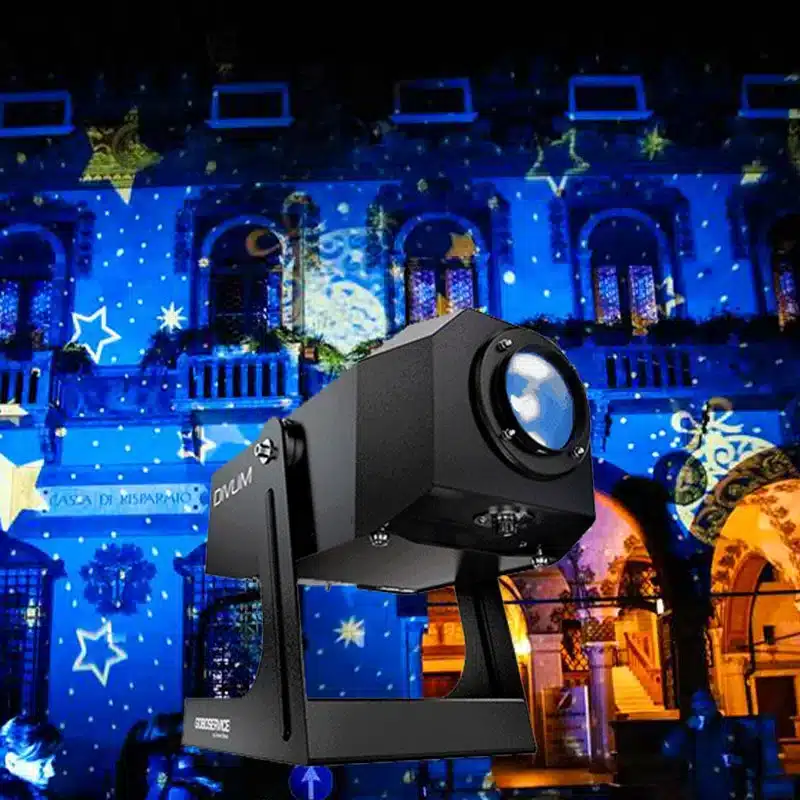 Divum 30K is a LED projector with extraordinary performance. The powerful 25.500 Lumen COB LED ideal for light projections over long distances. Thanks to its ease of use, the compact design and an IP54 degree of protection is perfect for outdoor projections and Christmas effects. The internal power supply is IP65 certified and forms an impenetrable barrier to atmospheric agents.