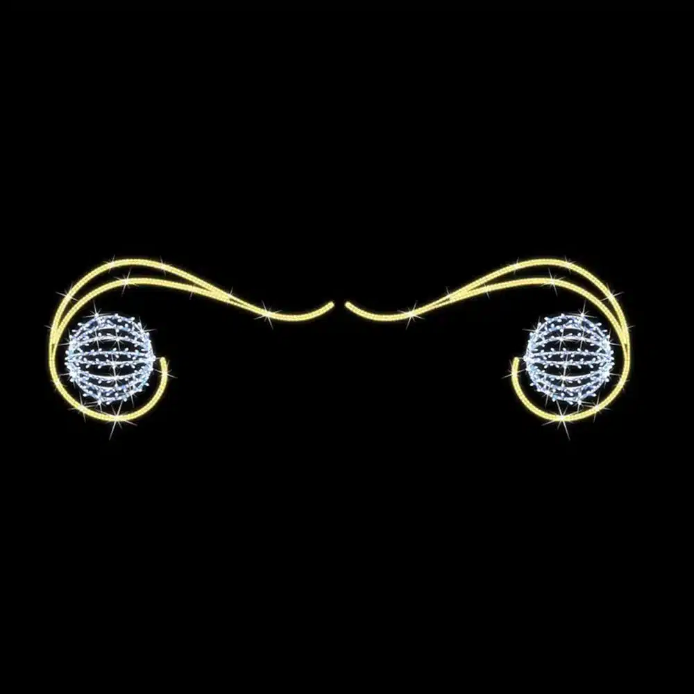 Add festive flair to your street décor with this bauble swish cross street motif. This elegant design features a graceful swish shape adorned with glowing baubles, combine LED rope light outlines with twinkling mini LEDs to create depth, sparkle and a festive glow that stands out day or night.