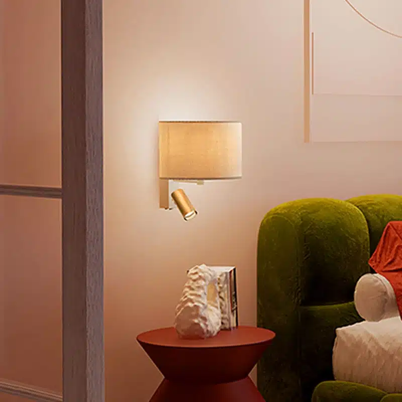 Elegant cream fabric wall light with adjustable reading spotlight, designed to combine soft ambient light with focused illumination. Ideal for bedrooms, guest rooms and cosy reading spaces.