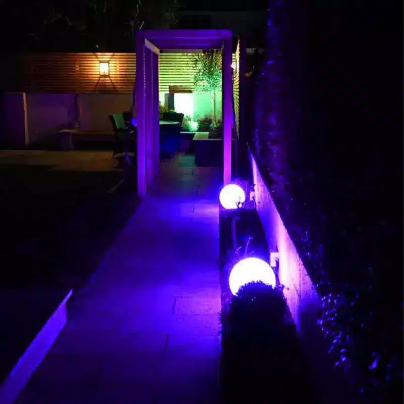 Kilmacud, Dublin garden lighting project features colour changing ball lamps, outdoor wall lights and spike lights to illuminate plants and garden features.