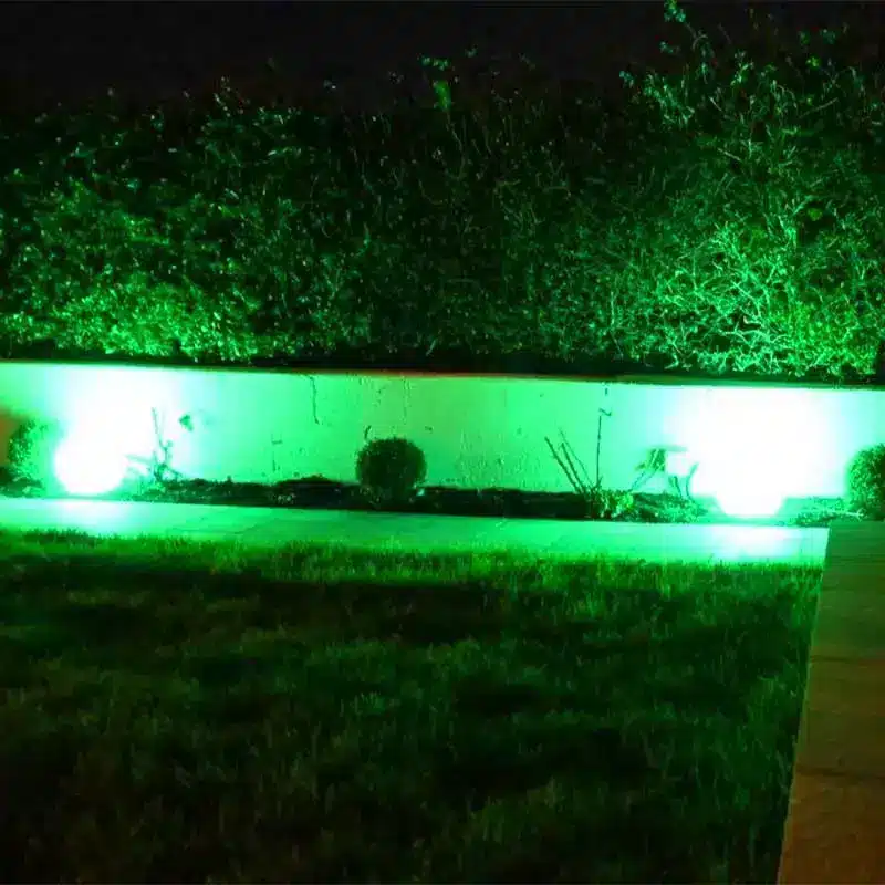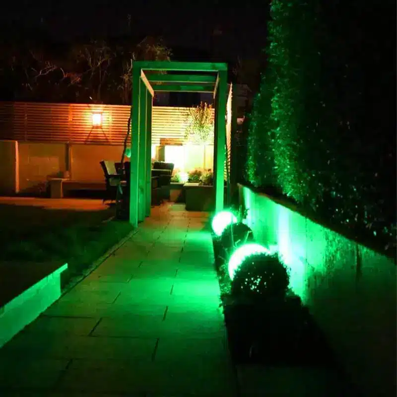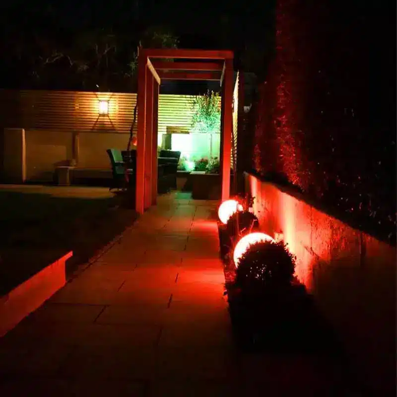 These LED ball lamps offer a wide spectrum of colour options, allowing homeowners to set the perfect mood for any occasion, whether it is a warm white glow for relaxing evenings or bold colours for outdoor gatherings. The entire system was designed, supplied and installed by our fully qualified and certified electricians, ensuring a high-quality, weatherproof finish tailored to the client’s vision and garden layout.